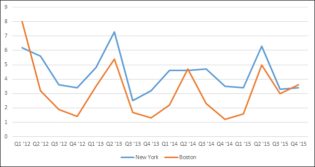 John Barrett of ON Partners (www.onpartners.com), a leading retained executive search firm, has compiled the results of the quarterly Digital Jobs Index. Hiring remains steady in both Boston and New York City. For the year, Boston came roaring back with its strongest hiring since 2012. New York, on the other hand, experienced a softening hiring environment in the latter half of 2015 and had its weakest year since our survey began in 2012. Overall, the hiring pace in New York still easily surpasses Boston's.